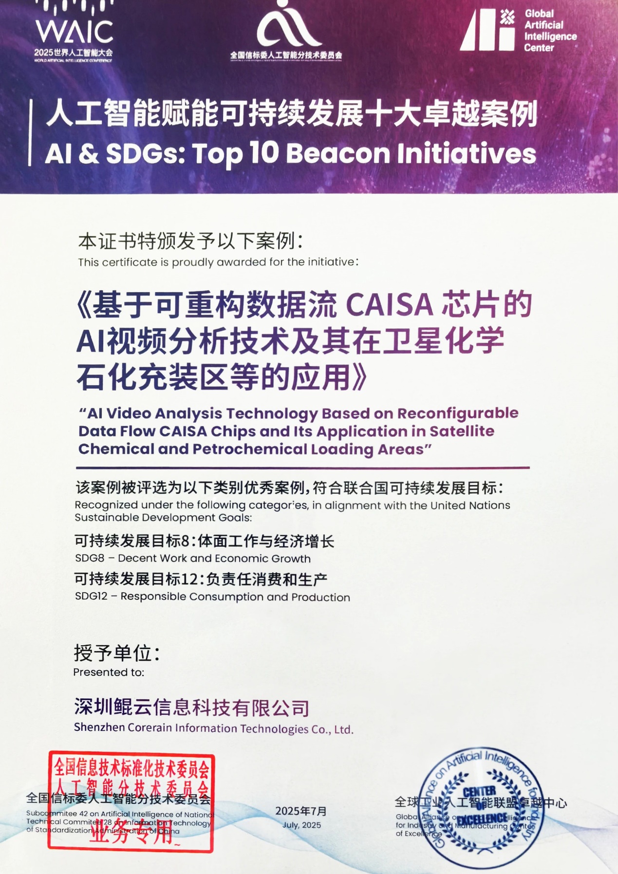 在同期举办的人工智能标准化国际合作论坛上,联合国工业发展组织(UNIDO)全球工业人工智能联盟卓越中心正式发布《人工智能赋能可持续发展十大卓越案例》。鲲云科技的“基于可重构数据流CAISA芯片的AI视频分析技术及其在卫星化学石化充装区等的应用”项目,从全球数百个参评案例中脱颖而出,成为工业安全领域唯一入选的标杆解决方案。此次入选的案例将被纳入联合国《可持续发展优秀实践库》,为全球提供可复用的智能治理范式。